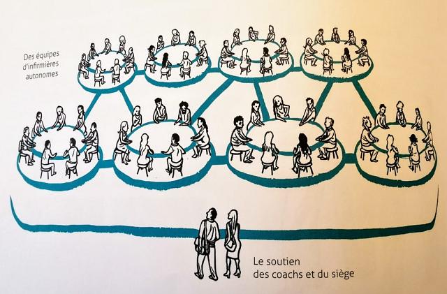Édicter des règles, construire une activité commune sans se transformer en bureaucratie, voilà le défi ! Dans son livre il cite l’exemple de Buurtzorg, cette entreprise de soins aux Pays-Bas qui compte 9000 membres, mais aucun cadre intermédiaire, elle est organisée de manière distribuée en petites unités autonomes de 10 à 12 infirmiers, le siège ne compte que 28 personnes !